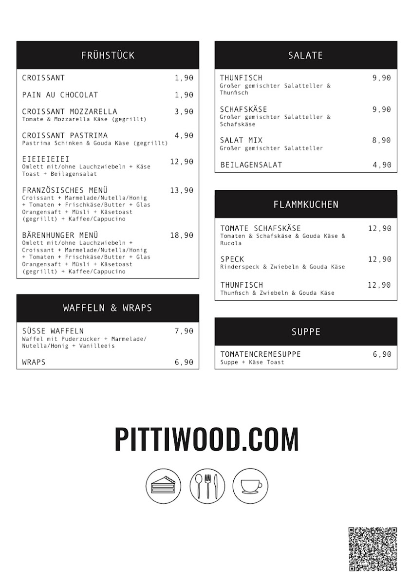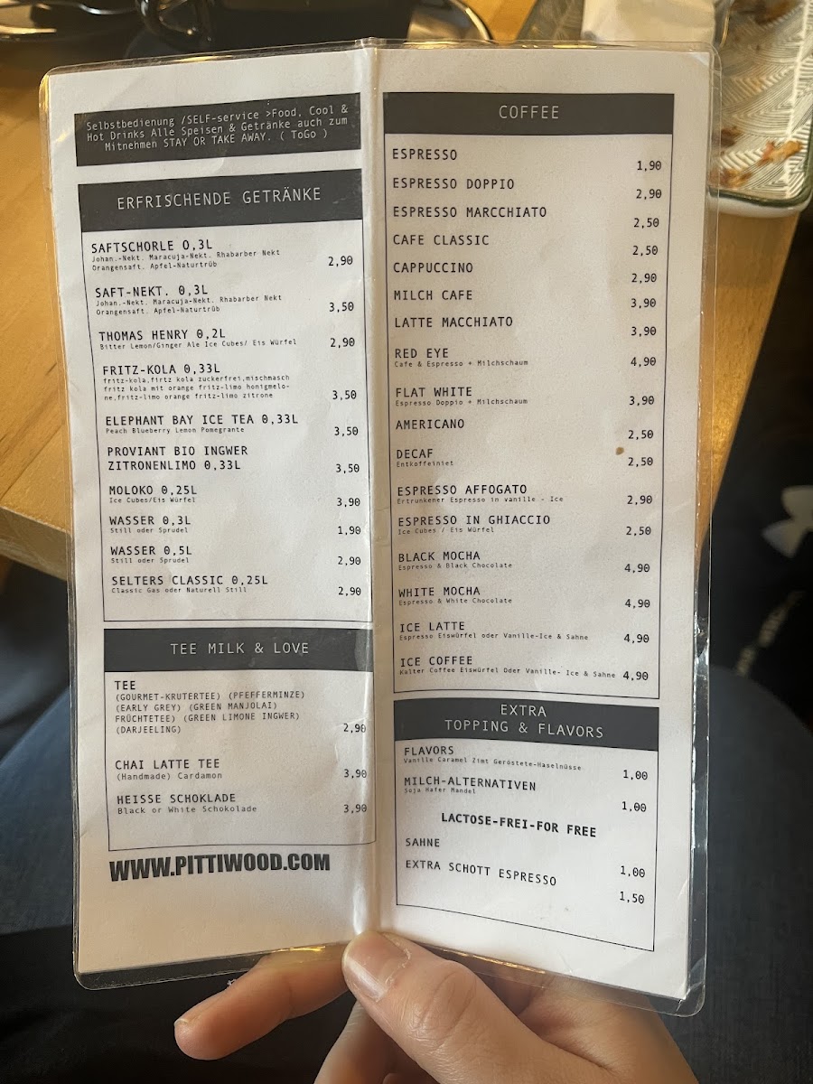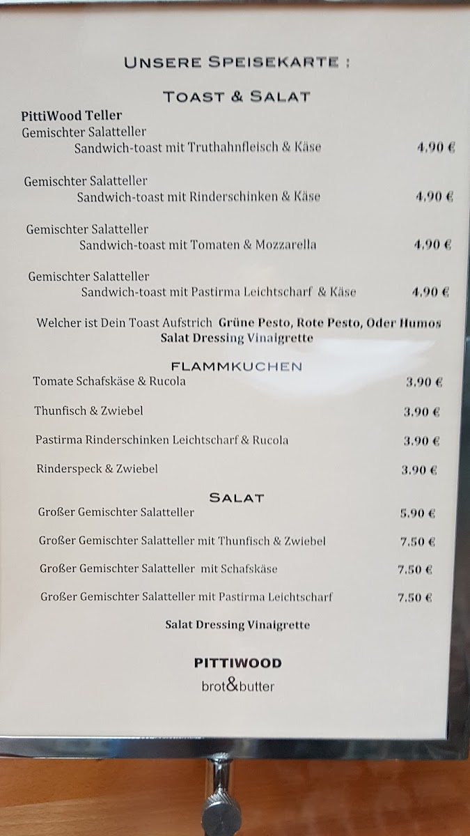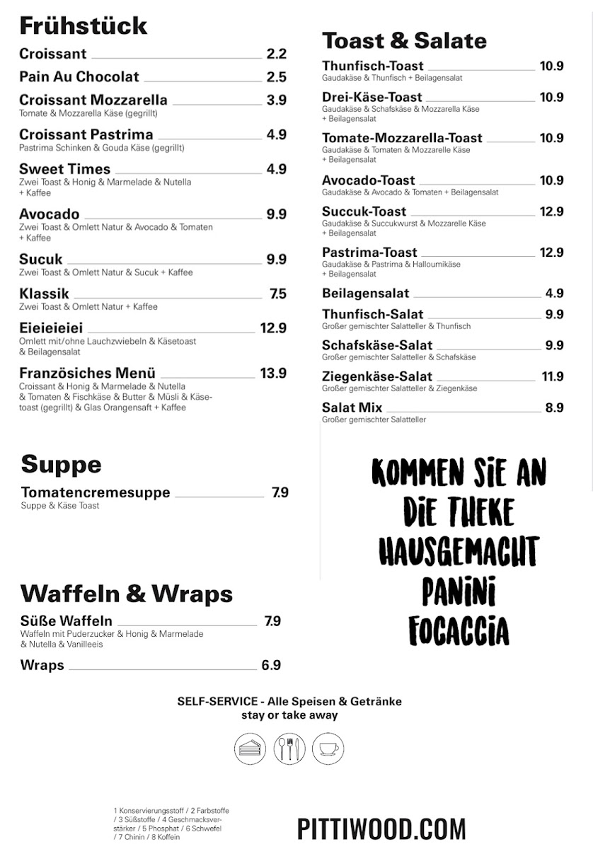 The menu at PittiWood offers a range of items suitable for breakfast, coffee breaks, and light meals. Visitors can expect a variety of coffee beverages alongside baked goods such as croissants, waffles, and pretzels. The food selection includes options like fresh bowl salads, quiche, panini with salami and cucumber, and different types of waffles.